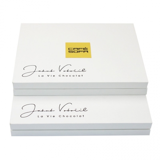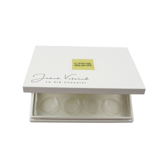 Il s'agit d'une boîte de chocolat blanche en forme de livre à clapet avec couvercle à charnière qui a fait en papier d'art C2S 157g + carton gris 1200g, le logo est estampé à la feuille d'or avec un plateau en PVC blister et du papier de soie.