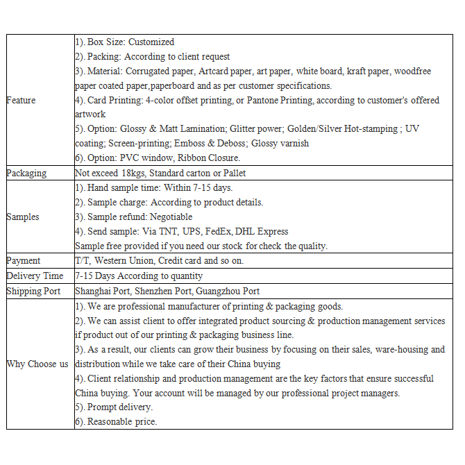 Remarque : Toutes ces photos de produits que nous avons publiées sur notre site Web sont uniquement à titre de référence sur le type d'emballage que nous pouvons fabriquer, cela ne signifie pas que nous vendons le même que le stock. Nous nous concentrons sur la personnalisation de toute taille/couleur d'impression/structure d'emballage en papier, etc.