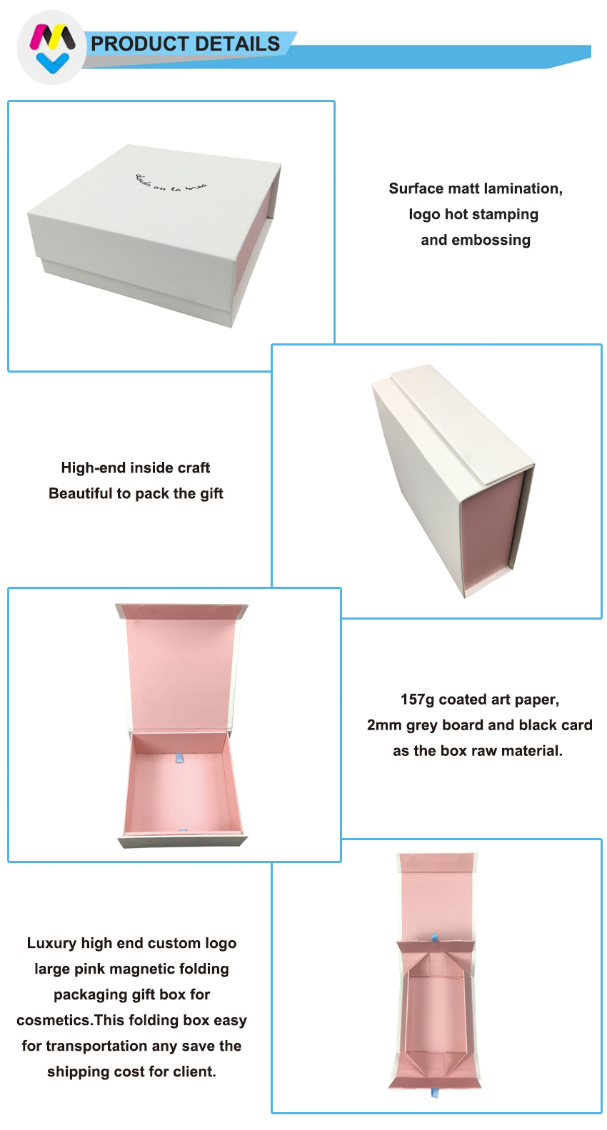 La boîte pliante renforcée peut supporter des produits plus lourds. Vous pouvez personnaliser votre coffret cadeau en fonction de votre produit. Nous pouvons répondre à des exigences telles que le renforcement de la résistance et l'augmentation des dimensions.